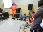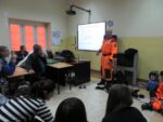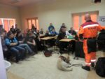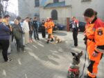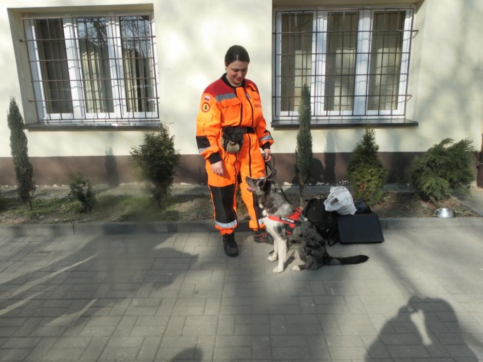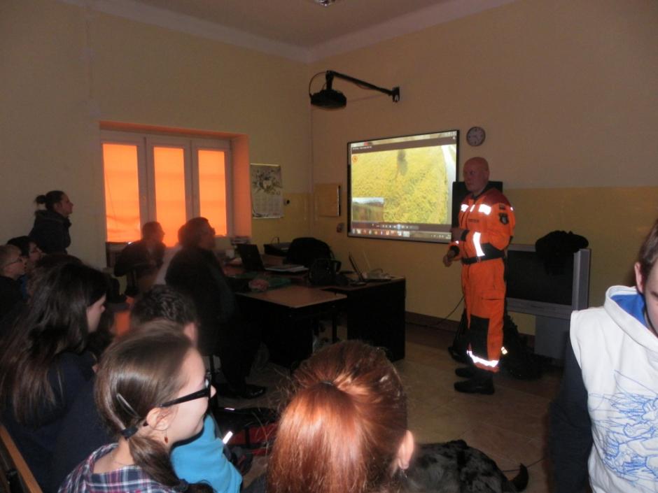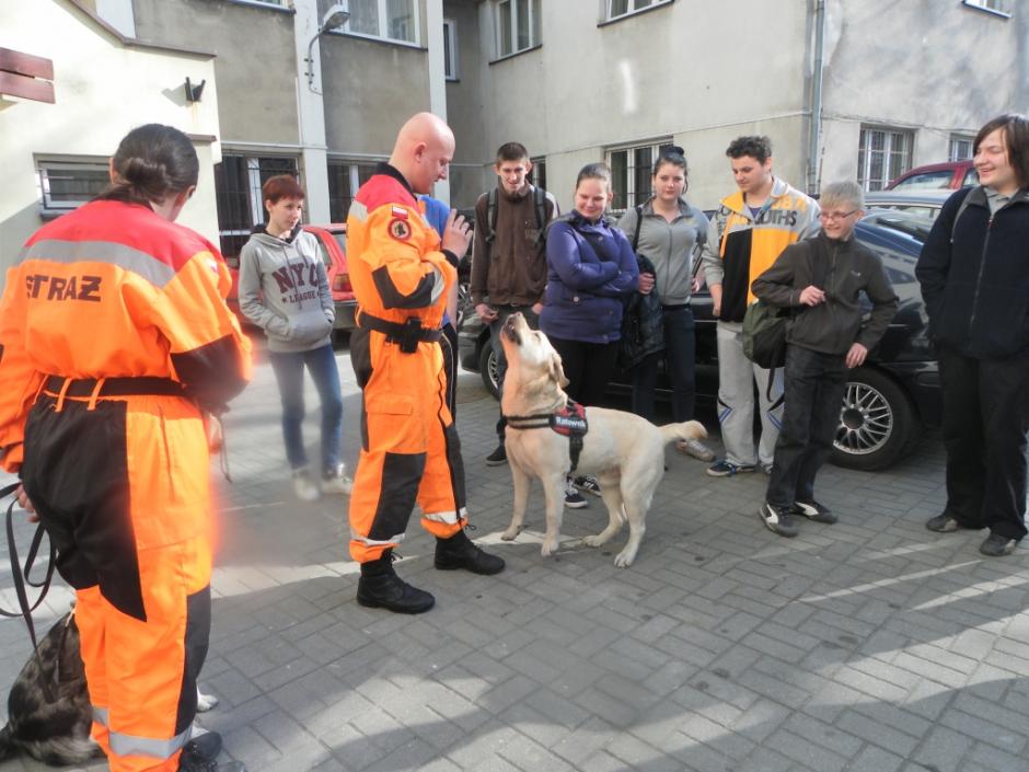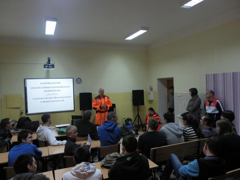 Przyjazd Przewodników z psami wzbudził zaciekawienie, radość i uśmiech na twarzach nie tylko uczniów, ale i kadry pedagogicznej. Uczniowie w skupieniu z zainteresowaniem słuchali o specyfice pracy przewodników oraz towarzyszących im psów uczestniczących w akcjach ratowniczych. Młodzież poznała m.in. różnice pomiędzy psem ratowniczym a psem policyjnym, urządzenia lokalizacyjne wykorzystywane w akcjach ratowniczych, wymogi stawiane ochotnikom do służby ratowniczej oraz etapy i trudy, jakie musi pokonać zarówno przewodnik jak i pies, by zdobyć certyfikat uprawniający do udziału w akcjach ratowniczych. Pan Jerzy Herma poinformował, iż wyszkolony pies w terenie potrafi zastąpić pracę wielu ludzi, a na gruzach może okazać się szybszy i skuteczniejszy od urządzeń lokalizacyjnych. Przewodnik wskazał również sytuacje, w których rola psa – ratownika jest niezbędna: poszukiwanie osób zaginionych w terenie otwartym, żywych osób uwięzionych w osuwiskach czy gruzowiskach zawalonych obiektów budowlanych. Dowiedzieliśmy się, że dla psa ratowniczego ważny jest zapach żywego człowieka, którego odnalezienie pies-ratownik sygnalizuje szczekaniem. Pan Jerzy Herma zwrócił także uwagę na to, że nie każdy pies nadaje się na ratownika. Zaznaczył, że ze względu na cechy charakteru i predyspozycje, psy-ratownicy dzielą się na psy ratownicze: gruzowiskowe, lawinowe, poszukiwawcze oraz dowodne.