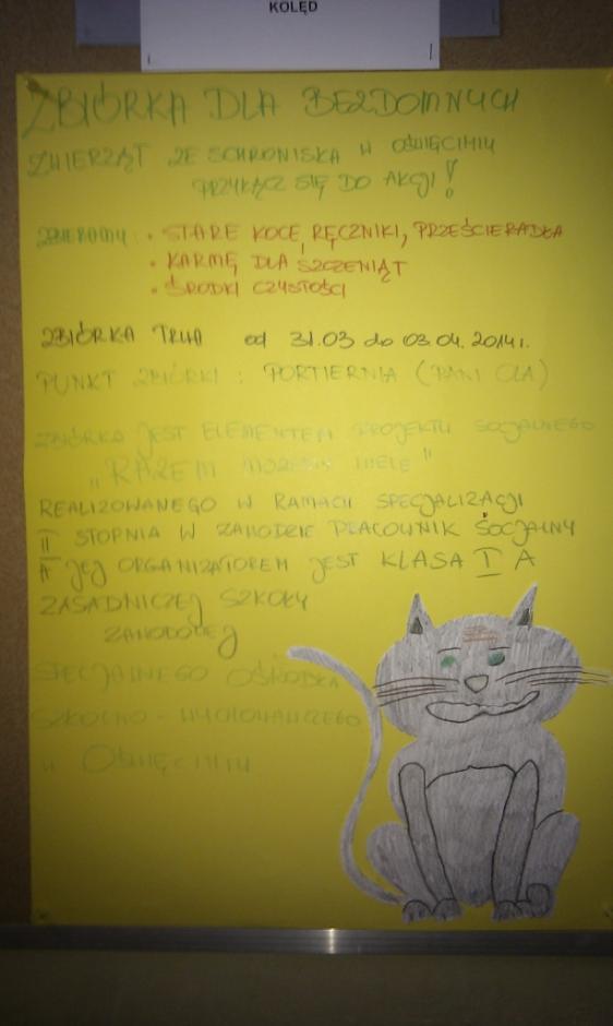 Nadmieniamy, iż w ramach realizowanego projektu uczniowie klasy IA Zasadniczej Szkoły Zawodowej zorganizowali zbiórkę na rzecz schroniska oraz budują budę dla bezdomnego psa, która wraz z zebranymi darowiznami zostanie przekazana schronisku.