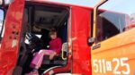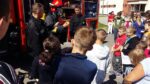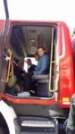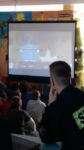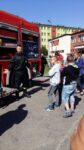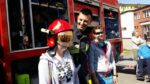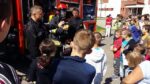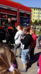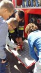 Następna część spotkania odbyła się na podwórku szkoły. Uczniowie obserwowali strażaków w pełni przygotowanych do pracy w strefie zadymienia, wyposażonych w aparat ODO i sygnalizator bezruchu. Największe zainteresowanie wzbudził wóz strażacki i jego wyposażenie.