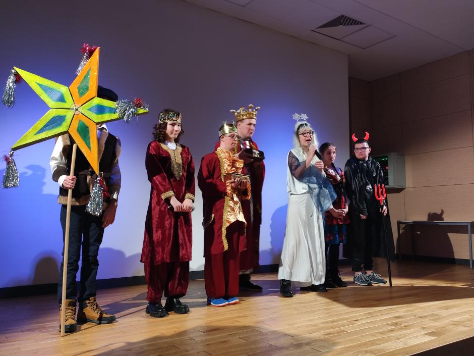 W dniu 11.01.2024r. w OCK odbył się XVII Konkurs Kolęd Polskich i Pastorałek „Hej kolęda, kolęda”, w którym wzięli udział nasi uczniowie. Utworzyliśmy grupę kolędniczą, która zaprezentowała się na scenie dwoma pastorałkami. Anna Kowalczyk wykonała pastorałkę pt. „Gwiazda”, a Emilia Chmiel „Kolędę dla nieobecnych”. Na końcu grupa kolędnicza zaśpiewała świąteczne życzenia. Za ten występ jury uhonorowało nas wyróżnieniem – otrzymaliśmy pamiątkową statuetkę i dyplomy. Gościliśmy również z występem na Szkolnym Konkursie Kolęd i Pastorałek w Szkole Podstawowej i otrzymaliśmy pamiątkowe dyplomy.