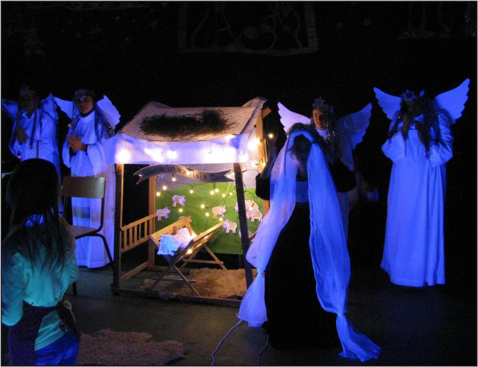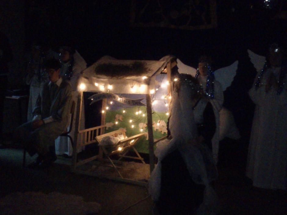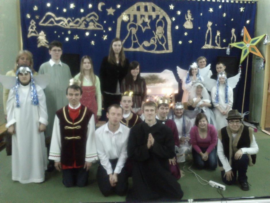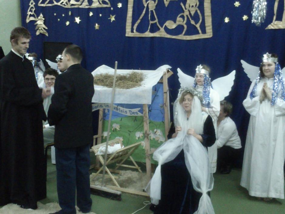 · obejrzeliśmy przedstawienie w wykonaniu naszych kolegów pt. „ŻYWA SZOPKA”, w której figury ożyły i olśniły nas anielskim blaskiem. Artyści pięknie śpiewali kolędy i w sposób niemal magiczny przybliżyli wydarzenia z narodzin Pana Jezusa