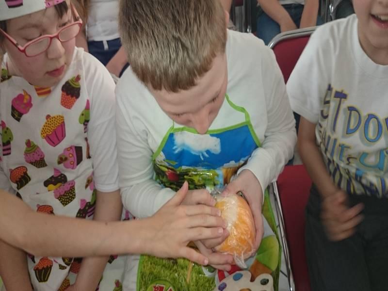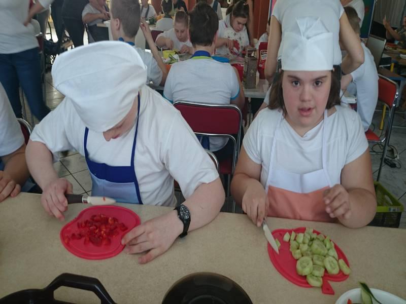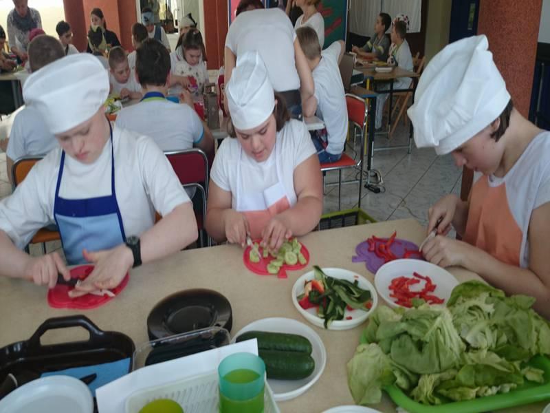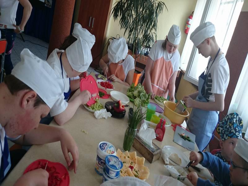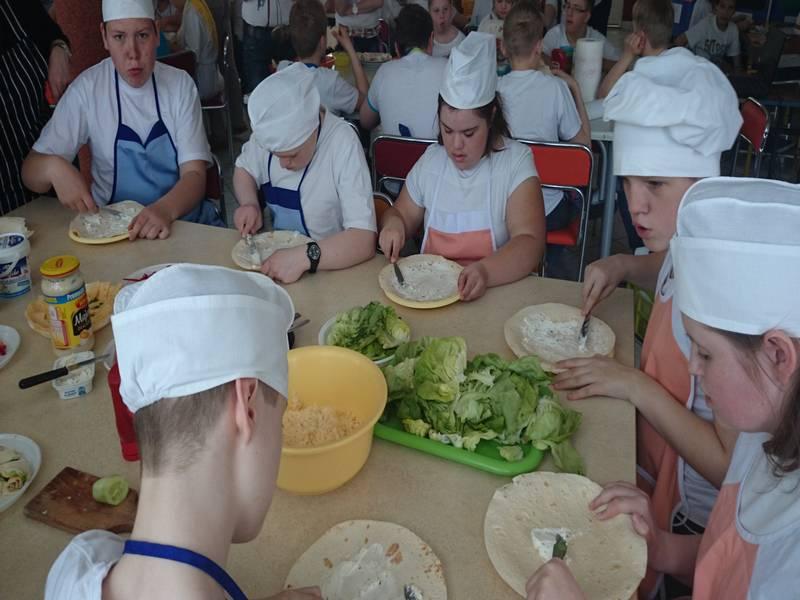 Podsumowaniem zdobytej wiedzy były warsztaty kulinarne, na których uczniowie zgodnie z założeniami WHO przygotowali pyszne wielozbożowe tortille mięsno-warzywne. Dużą przyjemność sprawiło dzieciom konsumowanie przygotowanych potraw. Przez cały czas zwracano uwagę na estetykę stołu i kulturę spożywania posiłków.