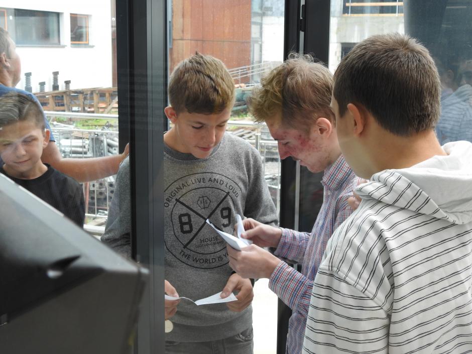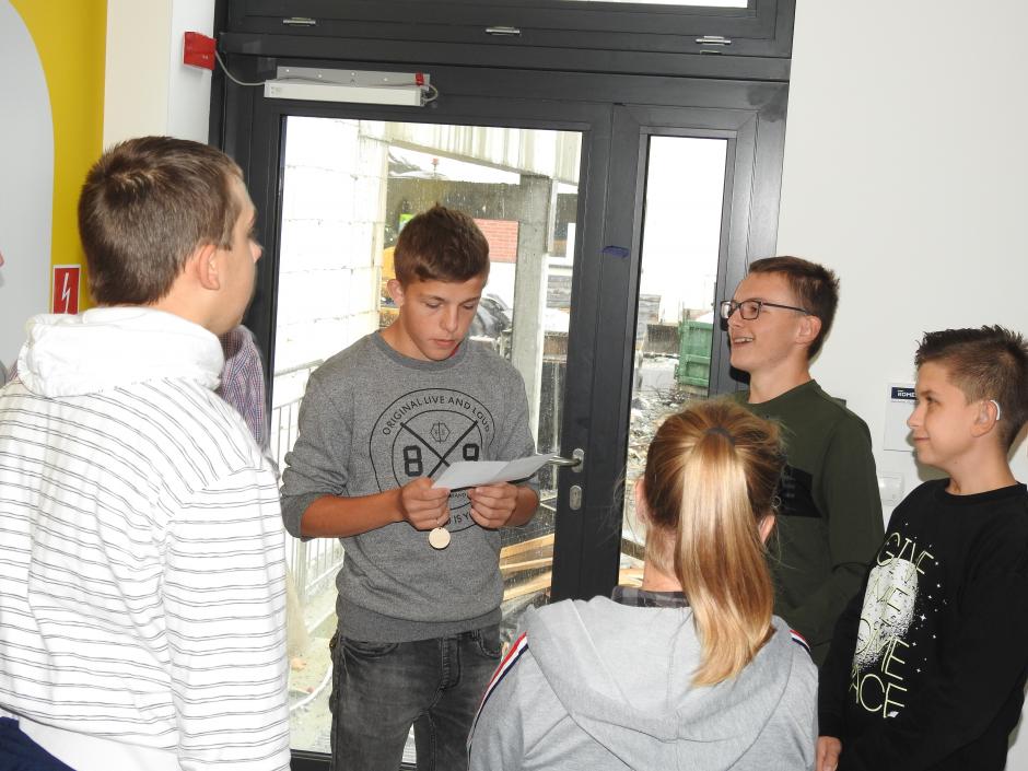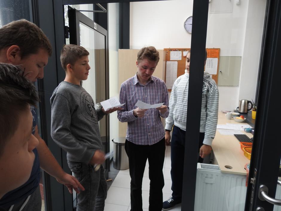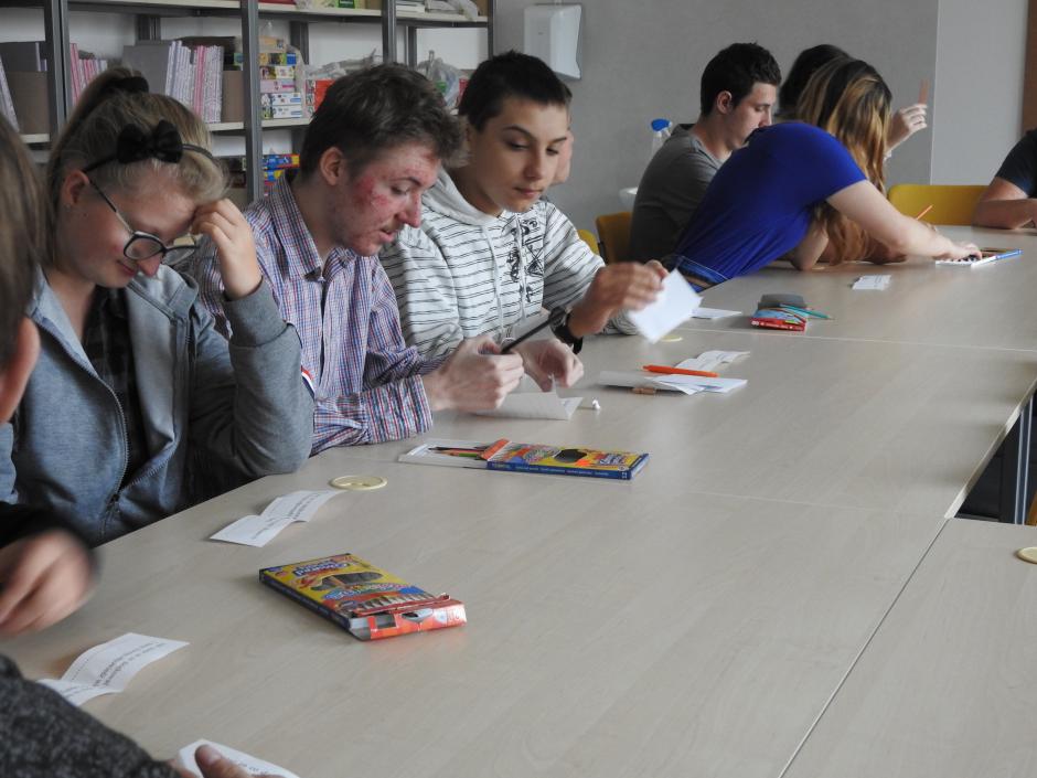 Klasy Szkoły Branżowej od 9.00 rano również miały swoje atrakcje. Uczniowie rozpoczęli dzień filmem pt. „Najlepszy” w szkolnym kinie, a po seansie uczestniczyli w rozgrywkach sportowych. Pod okiem Pani Julity odbywał się turniej tenisa stołowego, zaś pod okiem Pana Rafała turniej gry w siatkówkę. Wyróżniono trzech uczniów grających w siatkówkę, byli to Jakub Maciejczyk, Andrzej Foks i Krystian Kostka. W tenisie najlepsi byli kolejno Janusz Hillmann, Adrian Pasowiec i Marcin Grzesiak. Raz jeszcze serdeczne gratulacje dla Was! Kto na sport nie miał ochoty mógł wziąć udział w nauce wiązania krawata lub rozwiązać quiz z okazji Dnia Chłopaka. Najlepszy w wiązaniu krawata był Tobiasz Chrobak, z kolei najszybciej nauczył się tej sztuki Cyprian Pokrzyk. Gratulacje!