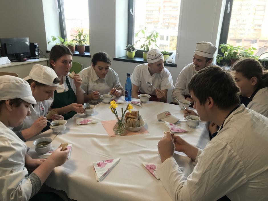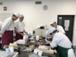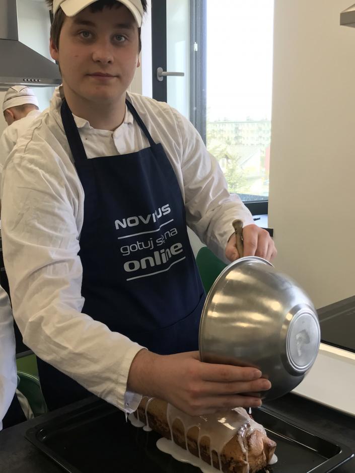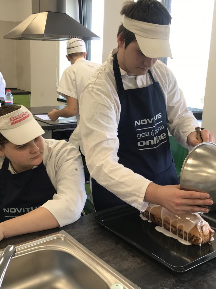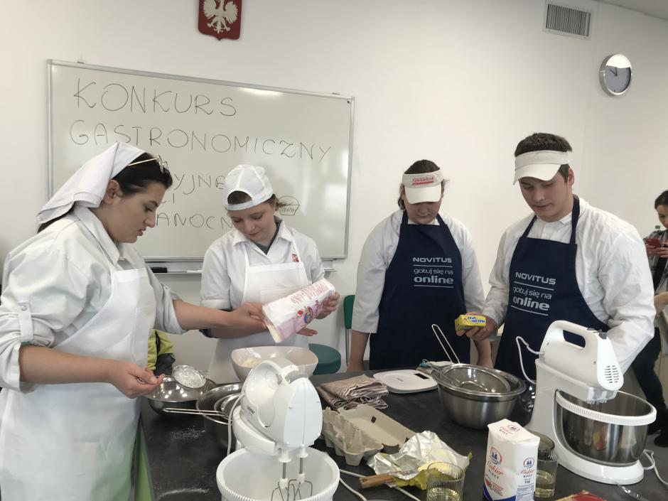 15 marca 2022 roku w naszej szkole odbył się I MIĘDZYSZKOLNY KONKURS GASTRONOMICZNY. Temat konkursu inspirowany był zbliżającymi się Świętami Wielkiej Nocy i brzmiał: Tradycyjne wypieki wielkanocne. Do rywalizacji stanęły cztery dwuosobowe drużyny. Ich zadaniem było wykazać się wiedzą teoretyczną na temat świątecznych wypieków oraz sporządzić babkę wielkanocną w kolorowym, wiosennym wydaniu. Uczestnicy upiekli babkę „tulipan” składającą się z ciasta o czterech kolorach i smakach: kakaowym, żurawinowym, makowym i naturalnym. Uczniowie z ogromnym zaangażowaniem wykonywali przydzielone im zadanie, planując również odpowiednią dekorację wyrobu gotowego. Efekt końcowy był zadowalający, stoły wyglądały pięknie a wypieki bardzo apetycznie. Biorąc udział w konkursie uczniowie nawiązali nowe znajomości, podnieśli swoją samoocenę i wiarę we własne możliwości.