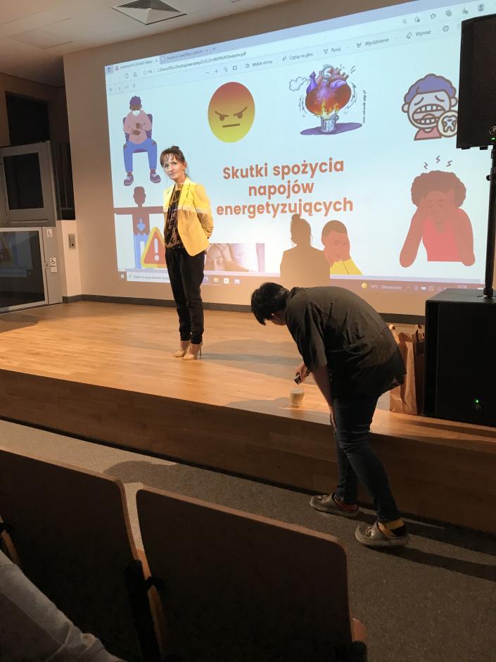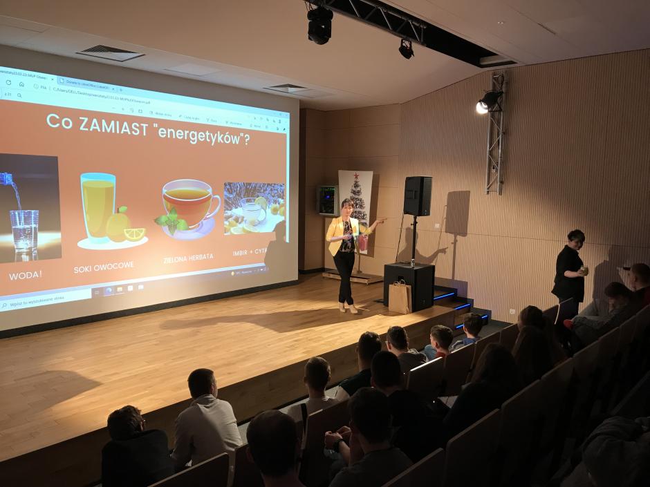 23 marca w naszej szkole odbyło się spotkanie z paniami dietetyczkami, w którym udział wzięli uczniowie Szkoły Branżowej oraz studenci kierunku „Dietetyka” z Małopolskiej Uczelni Państwowej w Oświęcimiu. Tematem przewodnim było nakłonienie młodzieży do zmiany nawyków żywieniowych, zwłaszcza ograniczenie spożywania napojów energetyzujących oraz żywności wysokoprzetworzonej zawierającej duże ilości soli.
