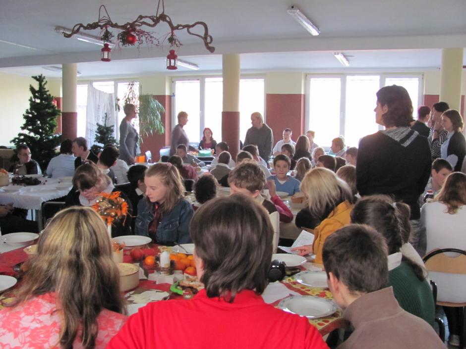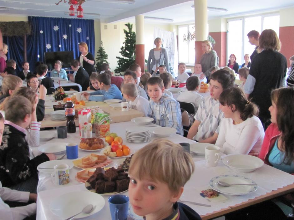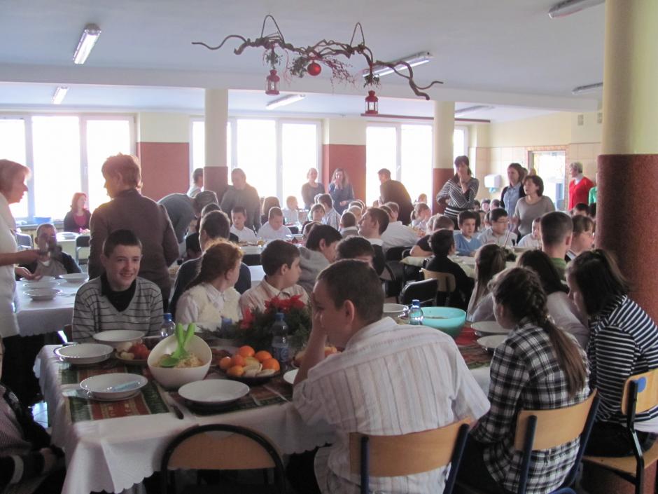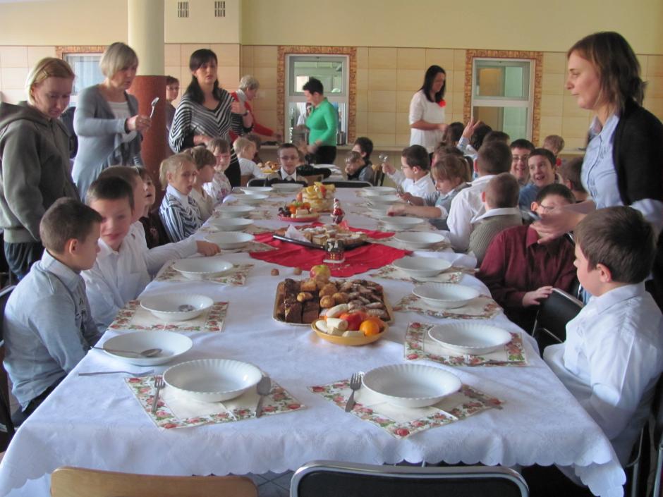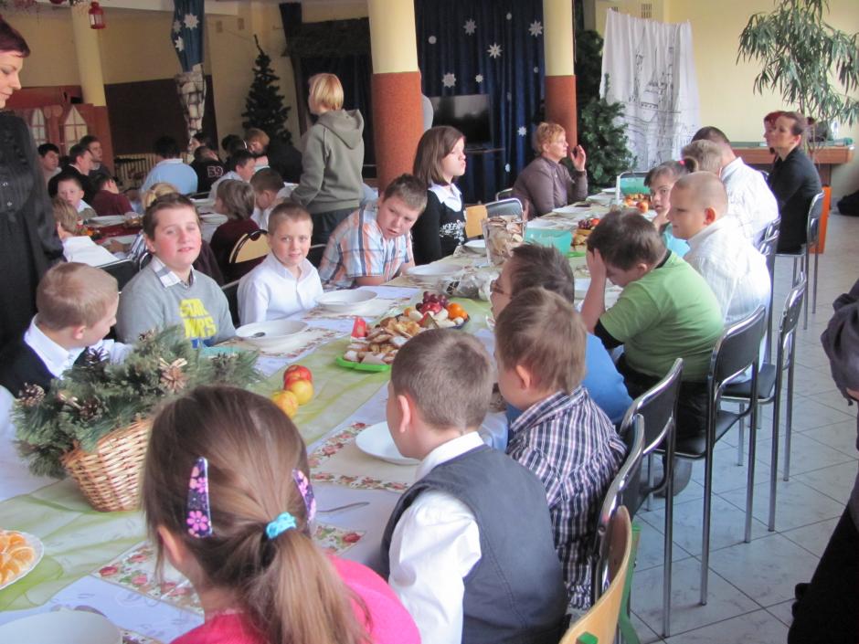 18 grudnia 2013r. odbyło się spotkanie Wigilijne. Wokół świątecznie nakrytych stołów, przy dźwiękach kolęd zgromadzili się wszyscy uczniowie Szkoły Podstawowej. Potrawy świąteczne na tę okazję przygotowaliśmy sami. Spotkanie przebiegało w bardzo radosnej, podniosłej atmosferze. Podczas naszej uroczystości były z nami: wicedyrektor d/s Szkoły Podstawowej, wicedyrektor d/s Gimnazjum, kierownik Internatu oraz specjaliści szkolni. Dzień ten był dla nas wyjątkowy. Uroczysta Wigilia pozwoliła nam poczuć i zobaczyć, że jesteśmy niepowtarzalną, jedyną w swoim rodzaju „Szkolną Rodziną”!