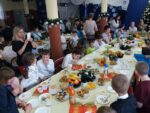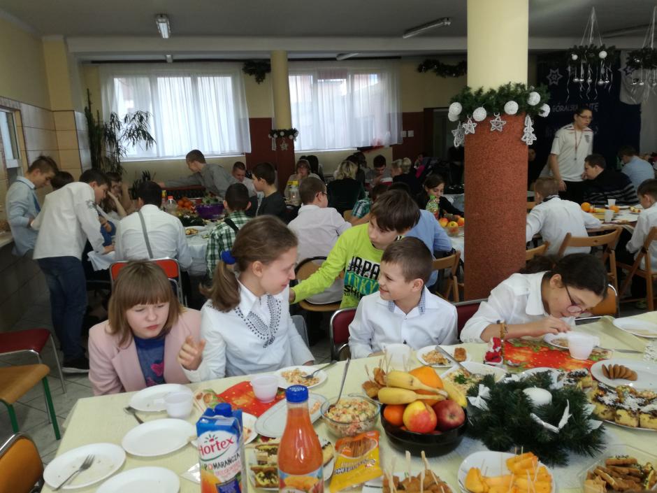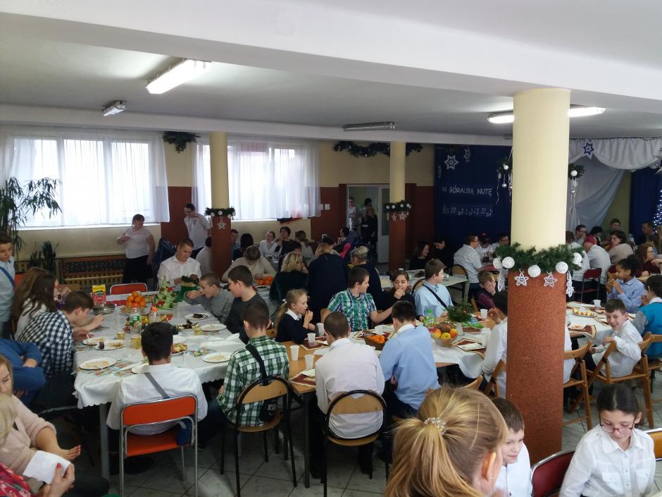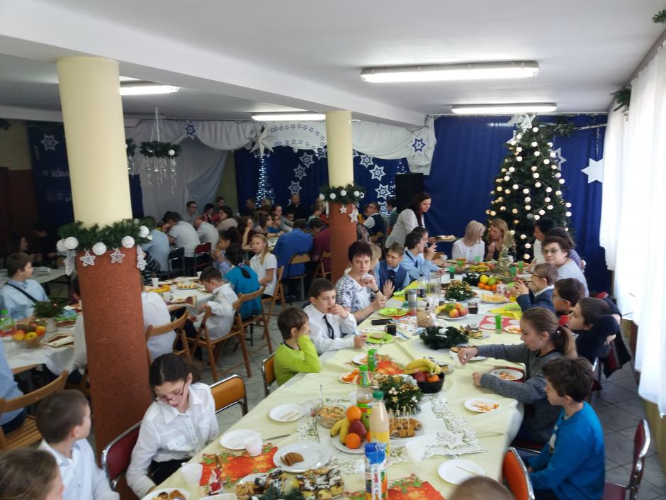 Wigilia to cudowne i piękne święto w naszej szkolnej rodzinie, które zaskakuje nas corocznie niezapomnianymi przeżyciami. W tym roku spotkaliśmy się wszyscy przy jednym stole 20 grudnia. Polska tradycja świąteczna, jest tak silna, że nie sposób jej ominąć. Rozpoczęliśmy zatem od odczytania fragmentu Ewangelii o narodzeniu Jezusa i wspólnej modlitwy. Następnie łamaliśmy się opłatkiem, symbolizującym miłość i przebaczenie i składaliśmy sobie życzenia zapominając wszelkie żale i niesnaski. Przy świątecznych stołach, choince spędziliśmy wspaniały czas rozmawiając, śmiejąc się, śpiewając kolędy.