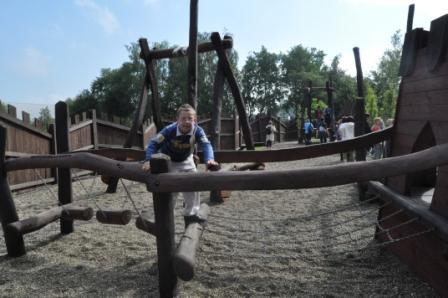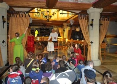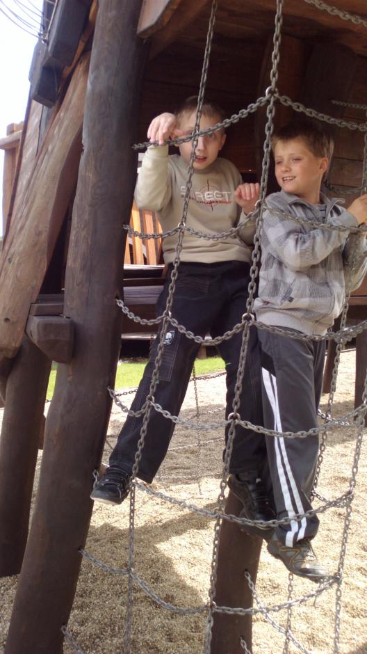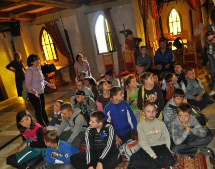 Powitani przez „mieszkańców” zamku przenieśliśmy się w czasy średniowiecza. Bawiliśmy się doskonale. Z uwagą wysłuchaliśmy bajki o „Pięknej i Bestii”. Udało nam się zatańczyć parę średniowiecznych tańców i przejść przez gardło smoka. Każdy mógł poczuć się jak średniowieczny rycerz i założyć hełm rycerski, rękawice i potrzymać prawdziwy miecz. Księżna zamku pasowała śmiałków na rycerza. Dziewczynki mogły zostać, chociaż przez chwilę, prawdziwą księżniczką. To nie był koniec atrakcji. Prawdziwym rarytasem była złocista kiełbaska kuchmistrza Bartłomieja z przepysznym chlebkiem upieczonym w prawdziwym piecu chlebowym. Wielką atrakcją był Średniowieczny Plac Zabaw wyposażony m. in. w: konika bujanego, piaskownicę z basztami, smoczą huśtawkę, wieżę gajowego, labirynt chatek z mostkami. Ogromnym powodzeniem cieszyła się machina oblężnicza, z której można było zjechać zjazdem linowym. Niektórzy z nas „przeszli samych siebie” pokonując strach przed nieznanymi nam do tej pory zabawami. Byli i tacy uczniowie, którzy dobrowolnie dali się zakuć w dyby. Warownia to naprawdę wymarzone miejsce dla dzieci. Chcemy wrócić tam znowu!
