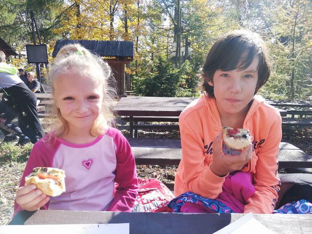 Droga na szczyt nie była wcale taka łagodna, zdarzały się dość strome podejścia, ale wszyscy, choć w różnym czasie dotarliśmy do celu – czyli Schroniska PTTK, gdzie mogliśmy zakupić napoje i drobne przekąski. Po posileniu się i chwili odpoczynku był czas na podziwianie wspaniałych widoków na Kotlinę Oświęcimską, Ponikiew, Wadowice i Andrychów.