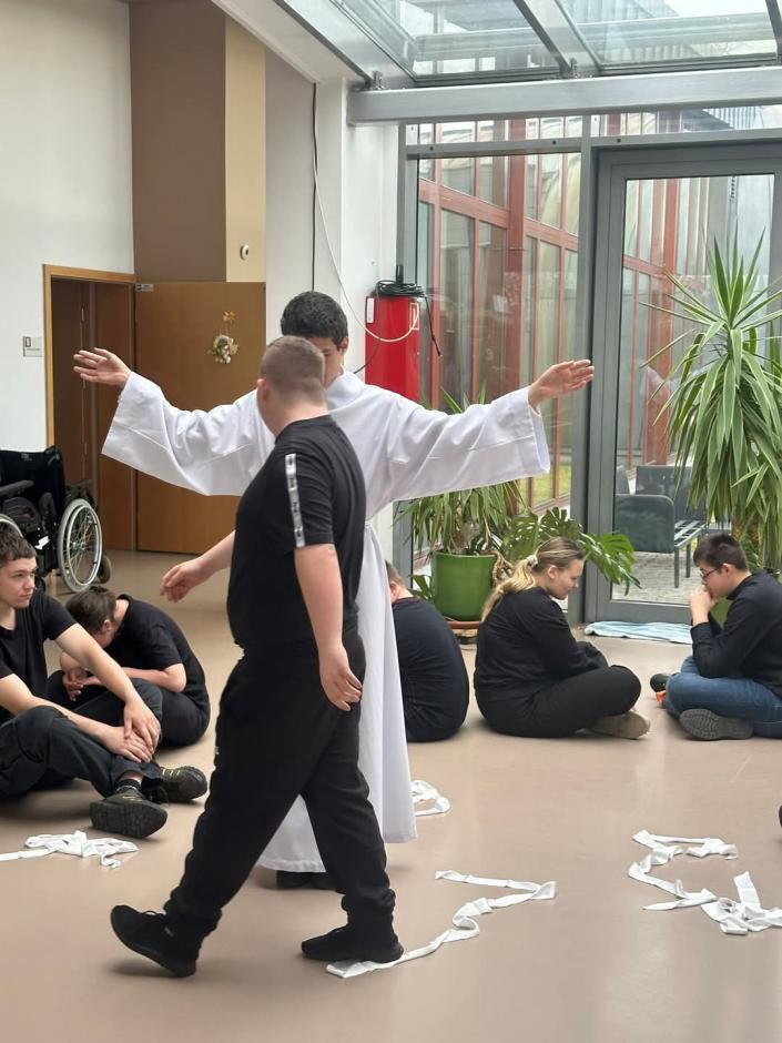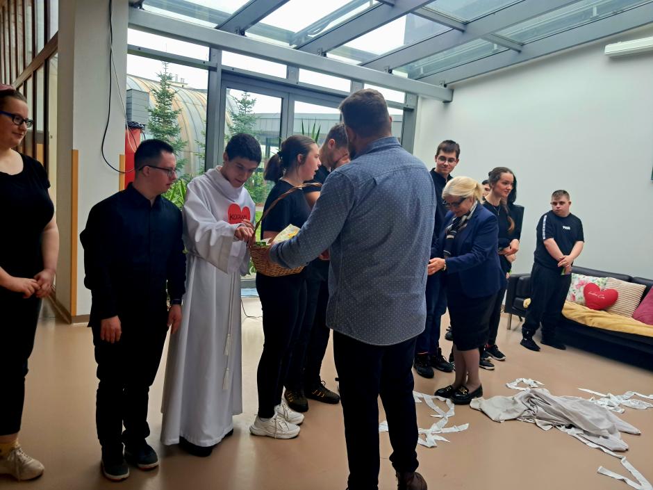 W dniu 15.04.2025r. uczniowie Szkoły Przysposabiającej do Pracy z klasy 1b PdP, 2a PdP, 3b PdP oraz 3c PdP wystąpili przed podopiecznymi oświęcimskiego hospicjum prezentując przedstawienie pt. „Ręce”. Było to przepiękne przeżycie i chwile wzruszeń dla wszystkich. Nasi uczniowie mieli okazję zobaczyć jak funkcjonuje taka placówka. Przy okazji przekazaliśmy liczne dary i kartki z okazji zbliżających się Świąt Wielkanocnych zebrane i wykonane przez naszych uczniów.