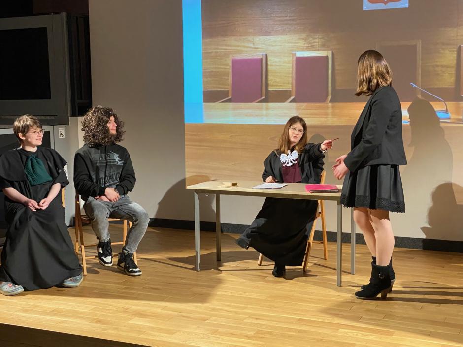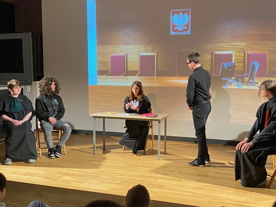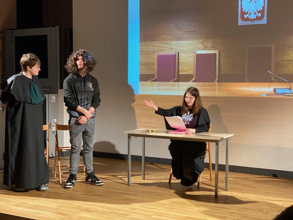 26 marca z okazji zbliżających się świąt Wielkanocnych mogliśmy podziwiać znakomitą grę aktorską uczniów ze szkolnej grupy teatralnej „A kto to?”. Tym razem wystawili spektakl pod tytułem „Wyrok”. Jak każde z poprzednich przedstawień i to miało swoje przesłanie – Wiara w dobro, w Jezusa Chrystusa uwalnia nas z kajdan uprzedzeń, lęków, naszych ograniczeń i daje siłę do przezwyciężenia trudności. Przedstawienie uwieńczyła wzruszająca pieśń pod tytułem „Przychodzisz Panie mimo drzwi zamkniętych” w wykonaniu uczennicy Justyny Tomali.