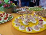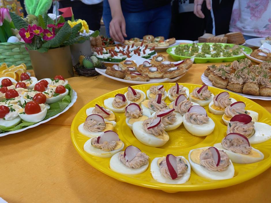 Po pięknym przedstawieniu cała społeczność szkolna udała się na świąteczne śniadanie. Na stole królowały jajka pod różnymi postaciami oraz kolorowe przekąski. Wszyscy uczniowie zaangażowali się w przygotowanie „BABECZKOMANII”. Każdy mógł skosztować babeczki, babki a nawet wielkiej baby. Świąteczny stół został przygotowany przez uczniów klas kucharskich i hotelarskich pod opieką p. Renaty, Doroty i Kasi.
