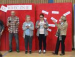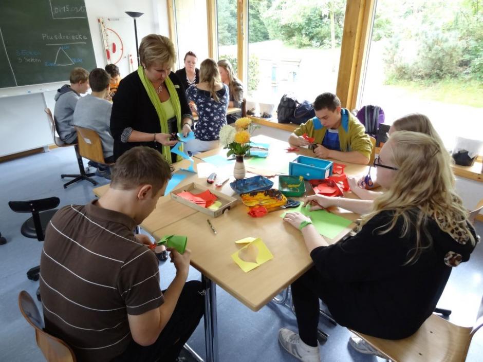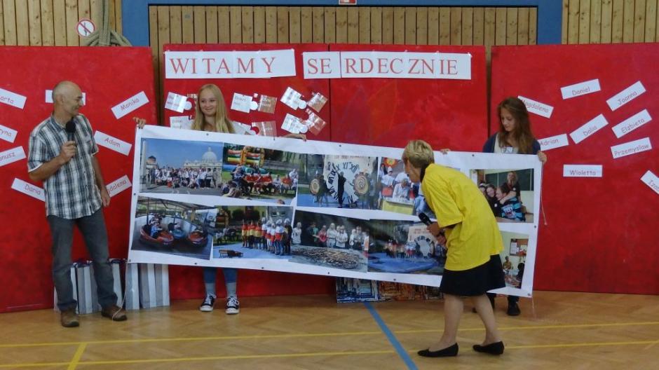 W poniedziałek, 14 września, zostaliśmy przywitani piosenką śpiewaną w obu językach przez niemieckich uczniów, nauczycieli oraz Panią Dyrektor Hannelore Preuninger. Wręczyliśmy gospodarzom baner ze wspólnymi zdjęciami, upominki w postaci obrazu z kolorowych gazet oraz prace plastyczne, które przygotowywaliśmy już od kwietnia. W prezencie nie zabrakło również polskich słodyczy zapakowanych do ręcznie uszytych sakiewek. Tego dnia wzięliśmy też udział w rozgrywkach sportowych.