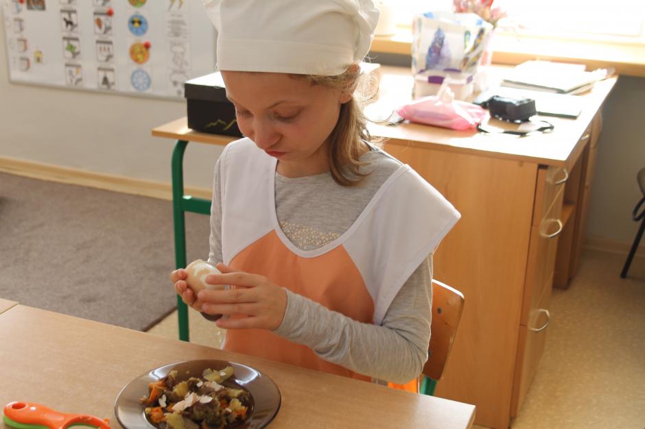 Podczas tych lekcji stymulowane są wszystkie zmysły. Wzrok: niesamowita ilość barw i kształtów. Słuch: kiedy się bierze do ręki pudełka z kaszą, ryżem, cukrem, makaronem i potrząsa nimi, to każde z nich wydaje inny dźwięk. Do tego różne odgłosy gotowania i narzędzi kuchennych. Węch: to jasne samo przez się. Smak: posmakować tych wszystkich rzeczy…hm… będę w siódmym niebie, albo się skrzywię. Dotyk: klejące, sypkie, zimne, ciepłe, śliskie itd. Ponadto podczas pracy dzieci uczą się współdziałania, samodzielności i wiary we własne możliwości, rozwijają małą motorykę, a co najważniejsze rozwijają zdolności komunikacyjne.