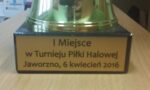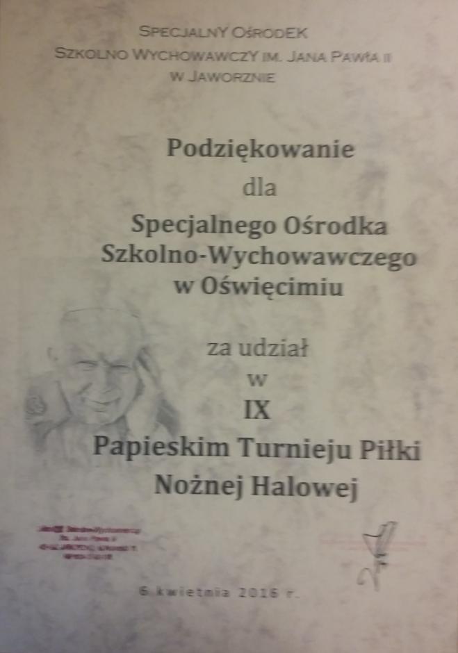 W dniu 6 kwietnia nasi uczniowie wzięli udział w cyklicznym Turnieju Piłki Nożnej Halowej w Jaworznie upamiętniający rocznicę śmierci Jana Pawła II. W turnieju wzięło udział 8 drużyn podzielonych na dwie grupy. Nasza drużyna trafiła do grupy B, gdzie odniosła komplet zwycięstw pokonując kolejno gimnazjum nr 5 z Jaworzna 1:0, SOSW z Jaworzna 4:0, SOSW z Mysłowic 1:0 zajmując 1 miejsce w grupie. W półfinale nasza drużyna dość gładko pokonała 3:0 zaprzyjaźnioną placówkę z Chrzanowa. W finale czekała na nich drużyna z gimnazjum nr 7 z Jaworzna, która również przez cały turniej szła jak burza. Nasi zawodnicy stanęli jednak na wysokości zadania wygrywając 3:0 i nie zostawiając żadnych złudzeń drużynie przeciwnej. Gratulację dla chłopaków, którzy w dość mocno obsadzonym turnieju nie stracili ani jednej bramki. Brawo!!!