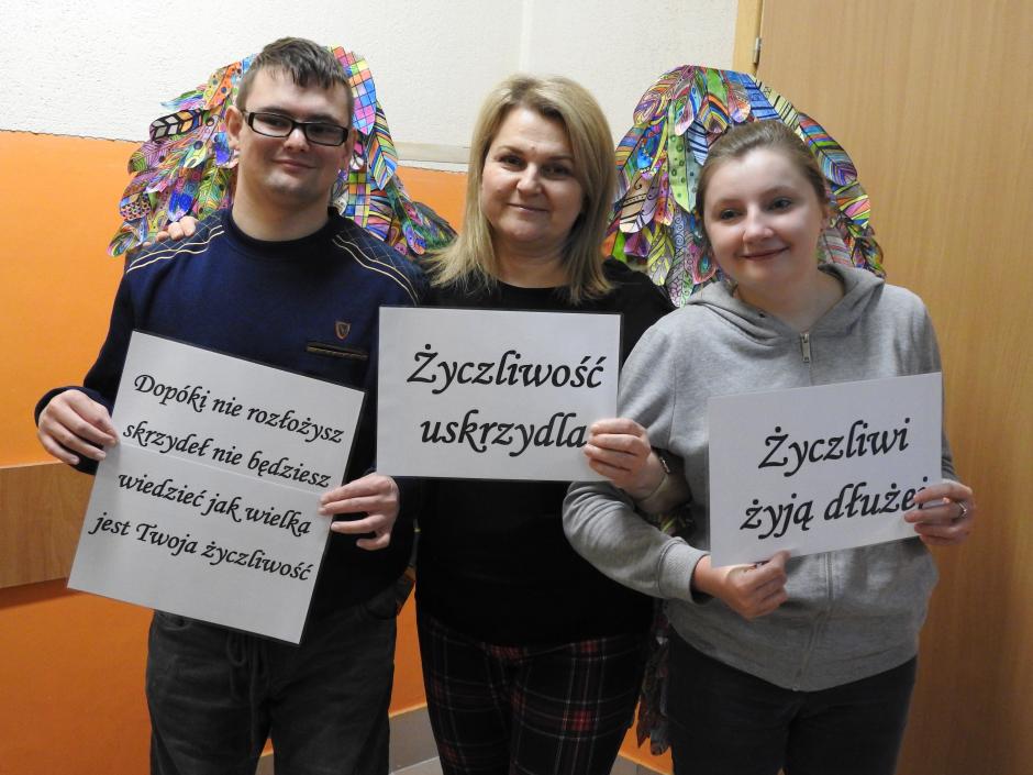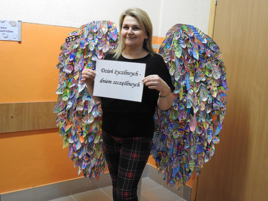 Życzliwość to uśmiech, ciepłe spojrzenie, kilka drobnych słów, niewymuszona grzeczność. Jak być życzliwym? Wystarczy kierować się zasadą: traktuj innych tak, jak sam chciałbyś być traktowany. W dniu 21 listopada obchodzimy Dzień Życzliwości. Z tej okazji powstały ogromne skrzydła symbolizujące dobroć, otwartość i właśnie życzliwość. Piórka do skrzydeł wykonali uczniowie i nauczyciele – niemal każdy z nich miał swój wkład. Barwna instalacja stanęła na korytarzu a każdy chętny mógł sobie wykonać pamiątkowe zdjęcie.